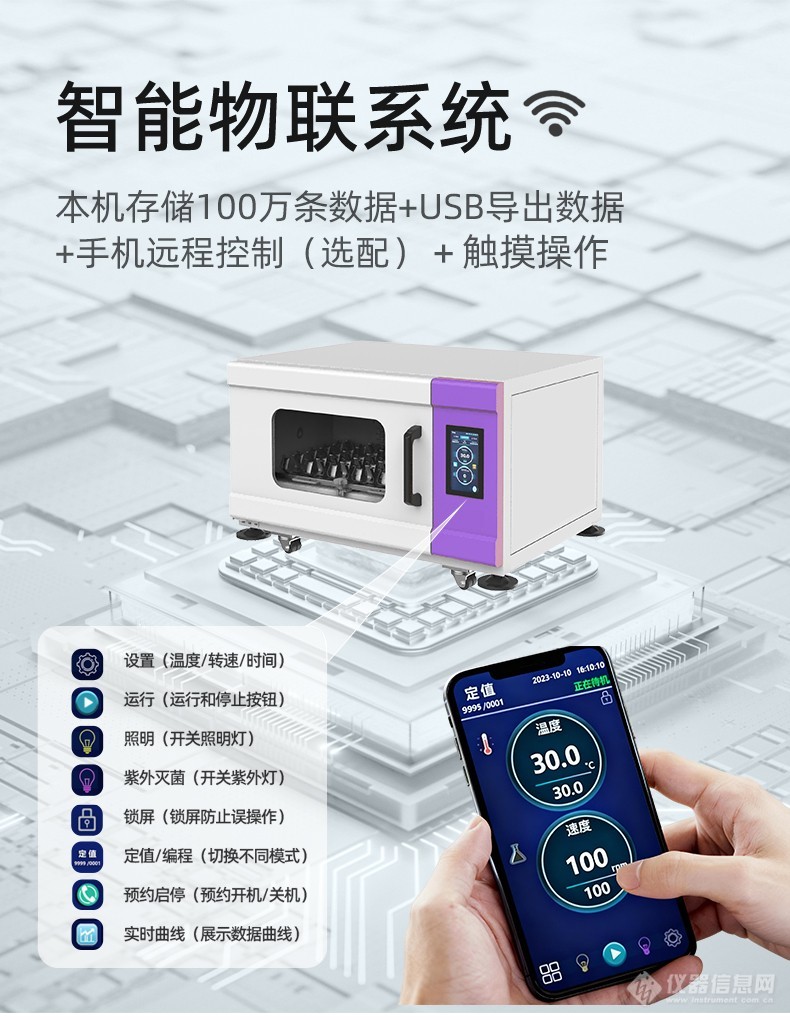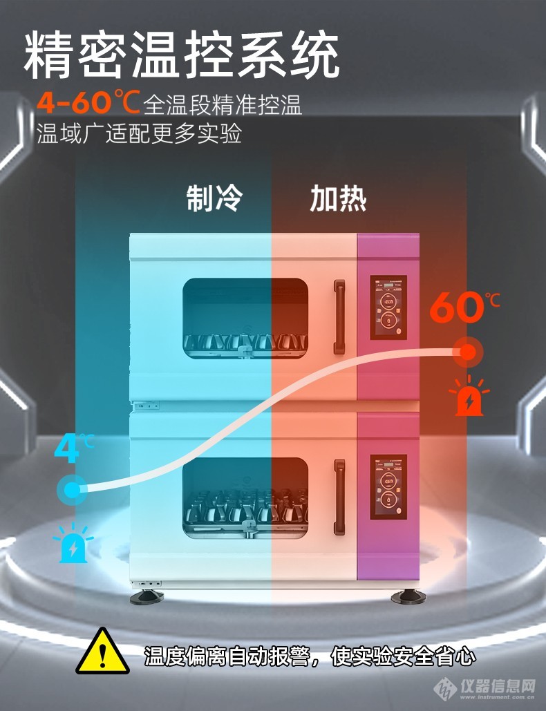 智能温控系统: 提供4~60℃的宽范围温度控制,满足从常温到低温培养的多种需求。