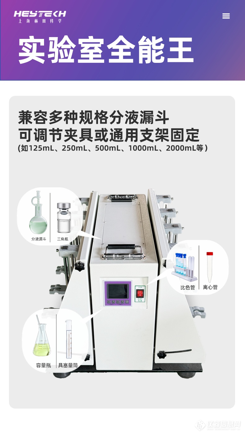 卓越的通用性与适配性:采用弹性无级可调夹具,可自由滑动,不仅能稳固夹持多种规格的分液漏斗(如125mL至2000mL),还能兼容容量瓶、三角瓶、具塞量筒、比色管、离心管等多种实验室玻璃器皿,实现一机多用。