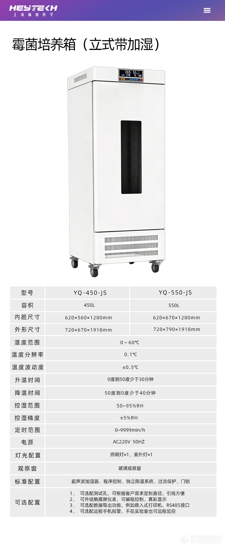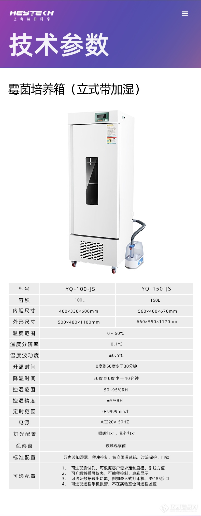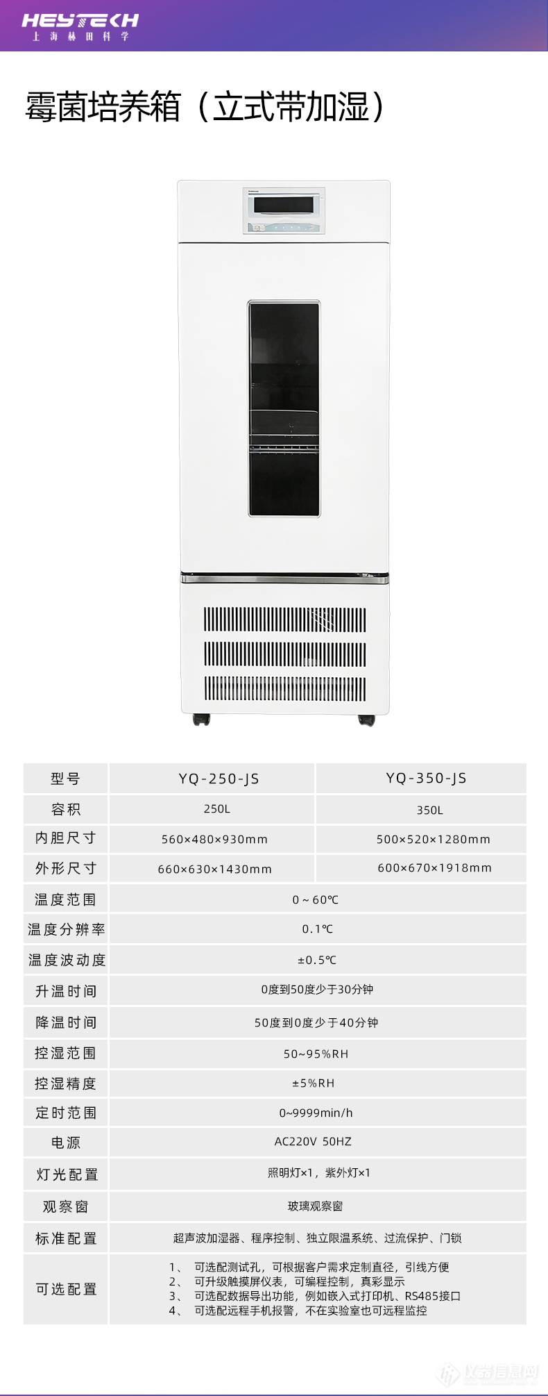 标准配置:超声波加湿器、程序控制、独立限温系统、过流保护、门锁、照明灯×1、紫外灯×1、玻璃观察窗。