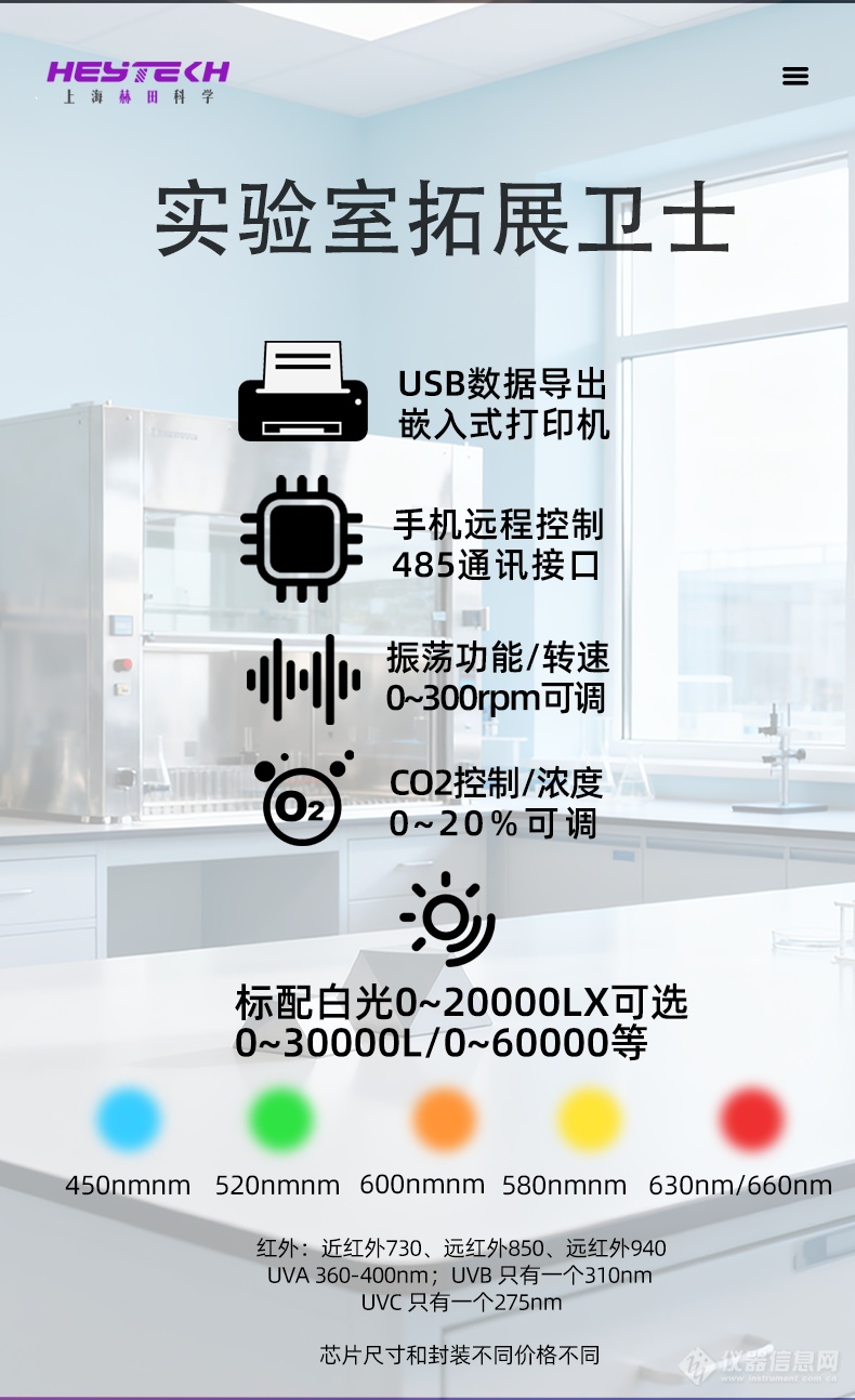5、 高级光照:除标配白光外,可提供更高强度光照(如0-30000/60000Lx),以及多种特定波长LED灯板,涵盖蓝光(450nm)、绿光(520nm)、黄光(580nm)、橙光(600nm)、红光(630/660nm)、近红外(730nm)、远红外(850/940nm),以及UVA、UVB、UVC紫外波段,适用于光生物学、光遗传学等特殊研究。
