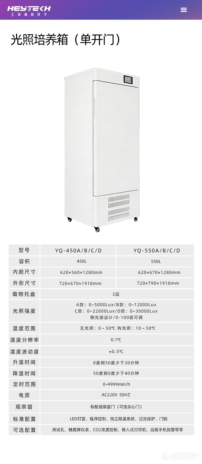 标准配置 | LED灯管、程序控制、独立限温系统、过流保护、门锁 |