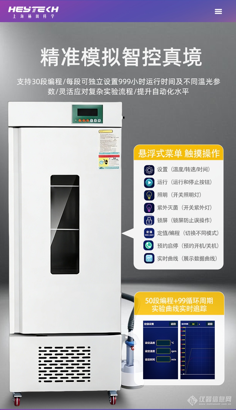 设备能够精确调控温度与光照强度,轻松模拟自然昼夜节律变化,为生理周期研究提供真实可靠的环境基础。30段编程控制系统允许每段程序独立设定0~999小时运行时间及不同参数组合(温度、光照强度、光照时间),灵活应对多阶段、变参数的复杂实验流程,显著提升实验效率与自动化水平。