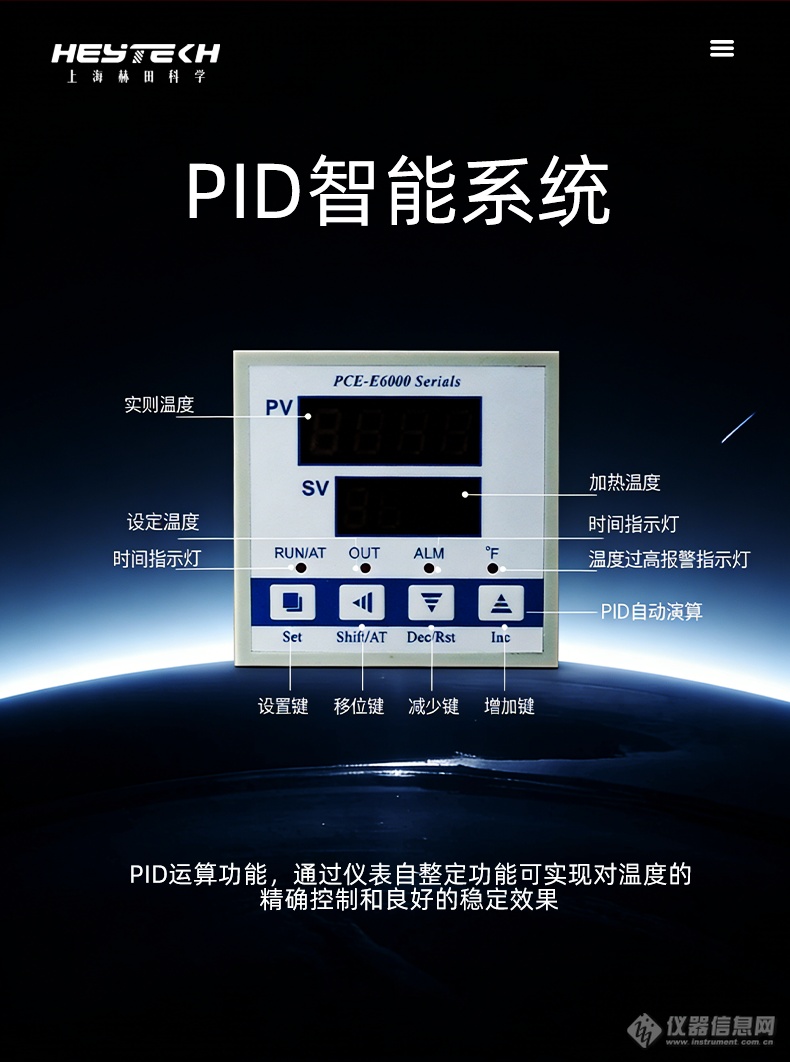 搭载品牌智能温度控制器,显示精度达0.1℃,可实时显示测量温度与设定温度。具备PID运算与自整定功能,能实现对温度的精准控制和出色的稳定效果。