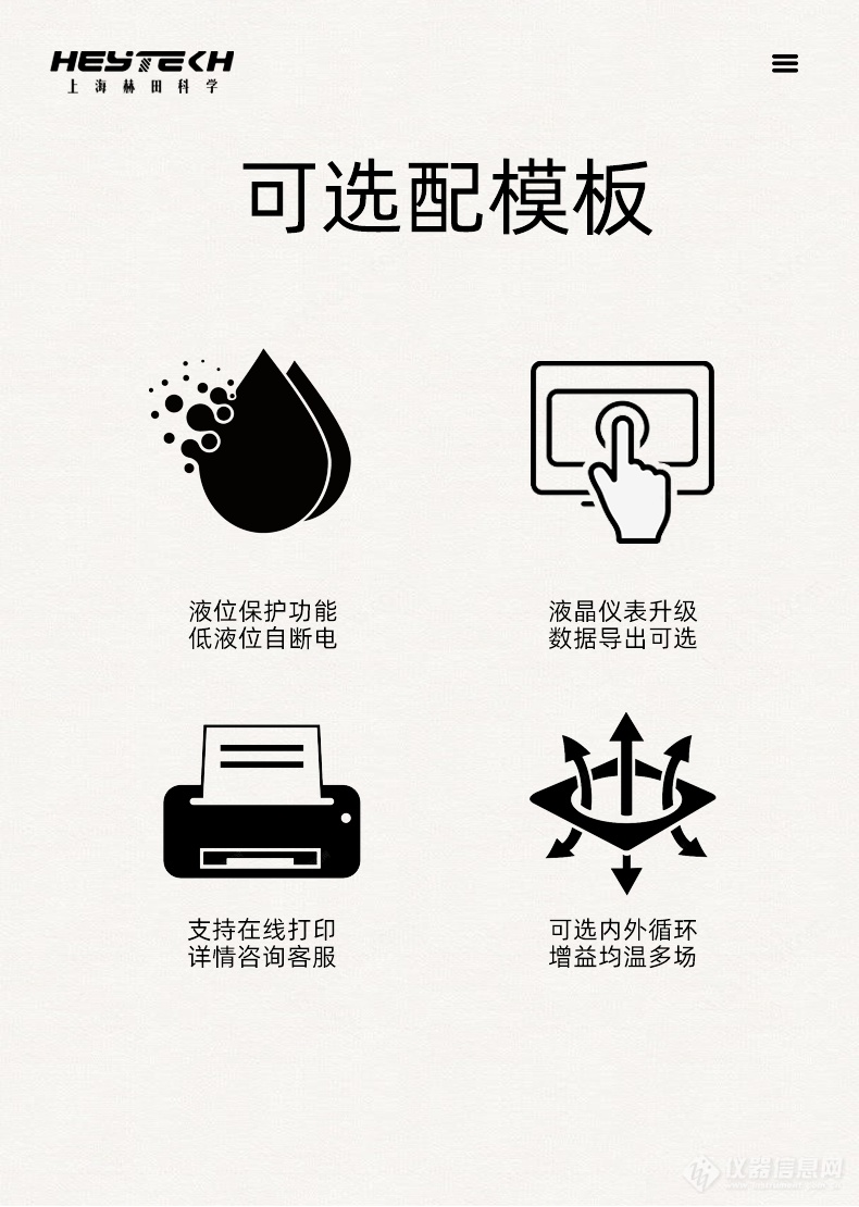 1、 液位保护:可选配低液位自动断电功能,防止干烧,保护设备与实验安全。