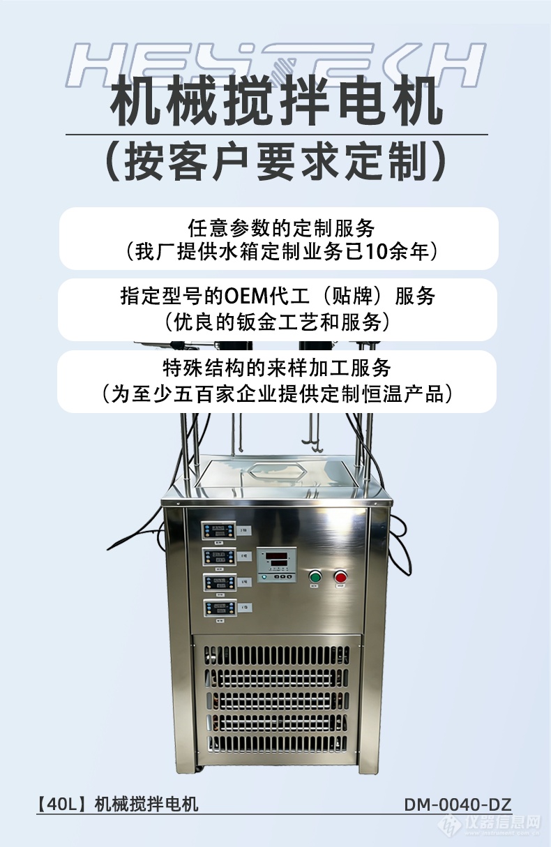 这台 DM-0040-DZ 四工位机械搅拌水浴锅,正是为客户特殊实验场景量身打造的非标定制产品。客户要求:40L大容积、0~100℃制冷加热双模式、同时支持四组机械搅拌。我们技术团队快速响应,从结构布局到动力配置全程定制,最终交付这台集恒温、制冷、搅拌于一体的多功能设备。